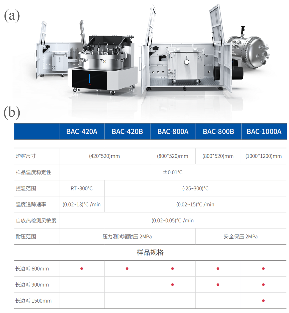 BAC-420A大型電池絕熱量熱儀0.01℃/min的自放熱檢測靈敏度及420*520mm的爐腔尺寸,讓實(shí)驗(yàn)室在面對能量密度與電芯尺寸均日益龐大的樣品時(shí)仍擁有極強(qiáng)的適應(yīng)性。
