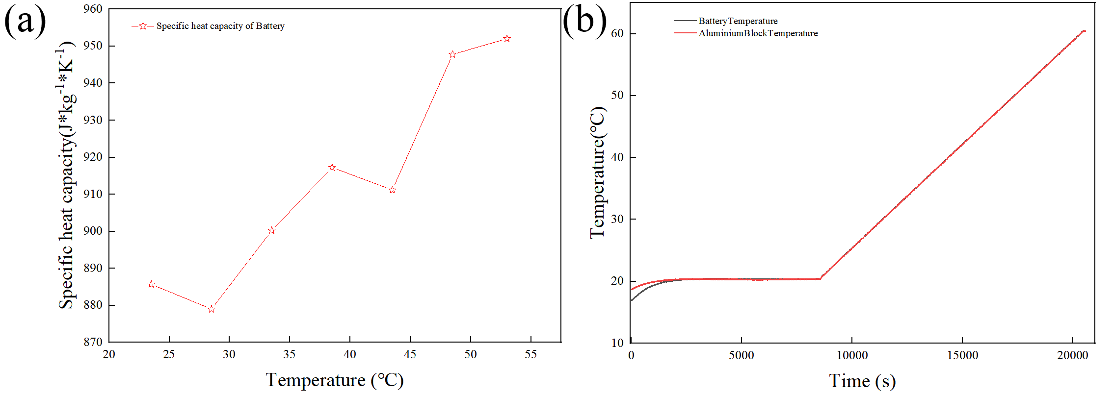某18650電池(a)變溫比熱容和(b)絕熱比熱容溫升圖
