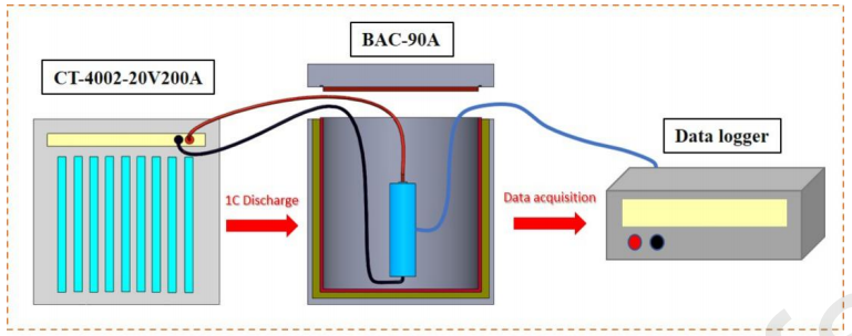 本研究中 BAC-90A 的應用:1.  單體比熱容測試比熱容是進行鋰電池熱管理系統(tǒng)瞬態(tài)仿真的關鍵熱物性參數(shù),用于定量分析電池產(chǎn)熱特性與研究電芯間熱傳遞規(guī)律等。小型電池絕熱量熱儀是測定電芯比熱容的有效手段。