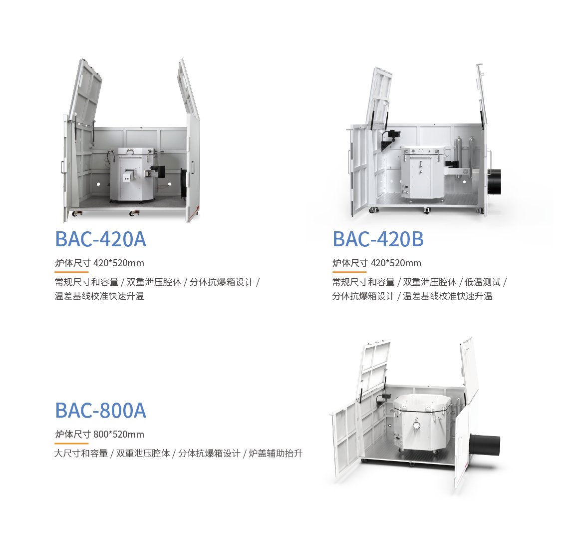 產(chǎn)品型號(hào)包含BAC-420A、BAC-420B和BAC-800A,保留了經(jīng)典ARC使用習(xí)慣。儀器結(jié)構(gòu)總體分為絕熱腔體、抗爆箱與電控系統(tǒng)三部分。泄壓型系列具備優(yōu)異的多重安全防護(hù)能力,利用彈簧鎖設(shè)計(jì),當(dāng)內(nèi)部壓力過(guò)高時(shí)爐蓋可彈起進(jìn)行快速泄壓,同時(shí)腔體內(nèi)部安裝爆破片進(jìn)行防護(hù)??贡涫褂脵C(jī)械安全聯(lián)鎖裝置,鋼板厚度 3.5mm,并安裝大流量排風(fēng)系統(tǒng)確保實(shí)驗(yàn)安全。
