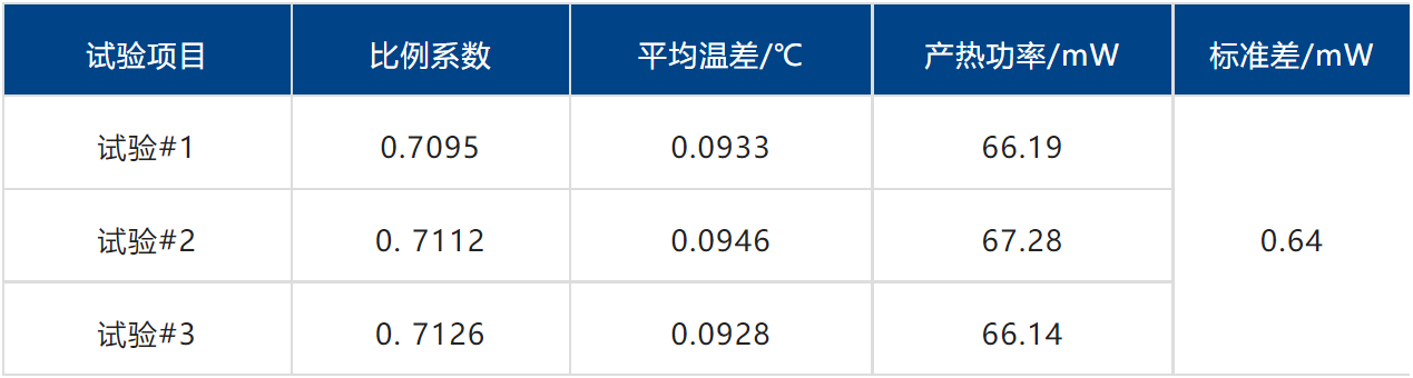 測(cè)量結(jié)果如圖3與表1所示,該讀數(shù)頭的產(chǎn)熱功率約為67mW,3次測(cè)試重復(fù)性優(yōu)于1%。另外,綠色陰影區(qū)域?yàn)榱繜醿x實(shí)測(cè)得到的產(chǎn)熱功率變化,藍(lán)色區(qū)域?yàn)橥茰y(cè)的讀數(shù)頭真實(shí)產(chǎn)熱功率。由于樣品自身的熱容以及讀數(shù)頭至冷板的導(dǎo)熱路徑上存在熱阻,實(shí)測(cè)數(shù)據(jù)存在一定的熱滯后現(xiàn)象。根據(jù)被測(cè)系統(tǒng)的傳熱特性,可以利用一階校準(zhǔn)公式對(duì)熱滯后進(jìn)行修正。