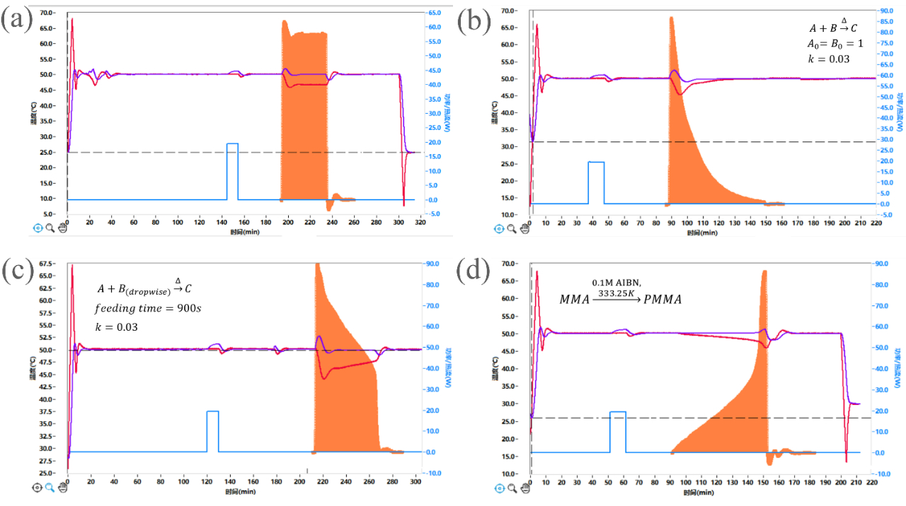 通過電源和加熱器進(jìn)行模擬熱發(fā)生,分別模擬了間歇式零級(jí)反應(yīng)(60W恒功率放熱)、間歇式二級(jí)反應(yīng)、半間歇式二級(jí)反應(yīng)以及具有一定自加速特征的聚甲基丙烯酸甲酯自由基聚合反應(yīng)的放熱變化趨勢(shì)[1]。上述模型反應(yīng)的量熱結(jié)果如圖3所示,橘黃色的熱流曲線能夠很好地匹配各反應(yīng)的動(dòng)力學(xué)特征。