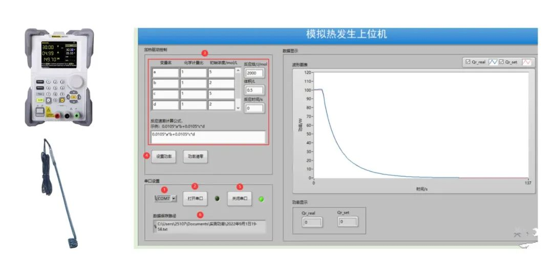 如圖2所示,在“模擬熱發(fā)生控制上位機(jī)”軟件中輸入模型反應(yīng)的動(dòng)力學(xué)方程,控制直流電源按照上位機(jī)實(shí)時(shí)計(jì)算的功率驅(qū)動(dòng)反應(yīng)釜內(nèi)的加熱棒產(chǎn)熱。計(jì)算功率和電源的實(shí)際輸出功率顯示在右側(cè)波形圖中。反應(yīng)量熱儀在“熱流”模式下對(duì)加熱棒熱功率進(jìn)行測(cè)量,并將測(cè)量數(shù)據(jù)與電源實(shí)際輸出功率進(jìn)行比較。反應(yīng)量熱儀在“熱流”模式下對(duì)發(fā)熱過程進(jìn)行測(cè)量,并將測(cè)量數(shù)據(jù)與電源輸出功率進(jìn)行比較。