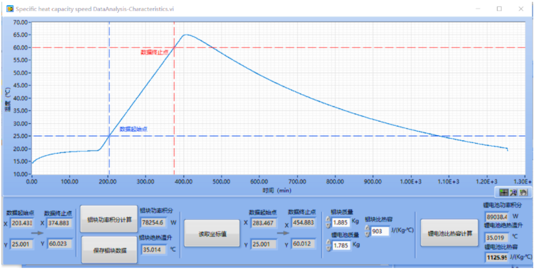 利用差式功率補(bǔ)償原理,絕熱量熱儀可測(cè)定電池比熱容的數(shù)據(jù),本文根據(jù)電池充放電過(guò)程的溫度變化范圍,測(cè)定該溫區(qū)內(nèi)的平均比熱容,用于計(jì)算電池放熱量,測(cè)試結(jié)果如圖2所示。