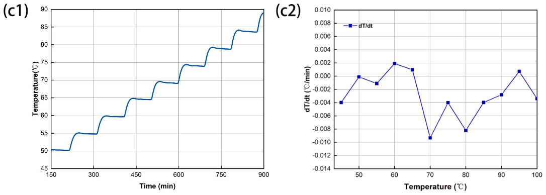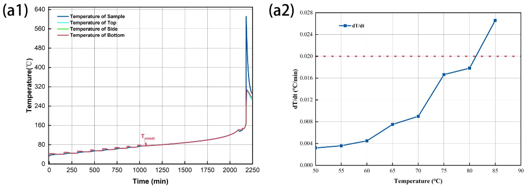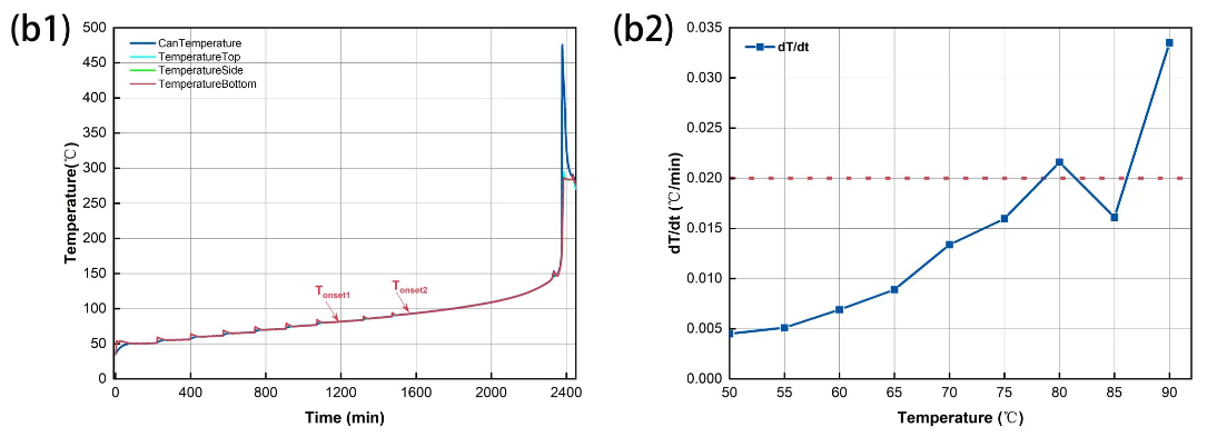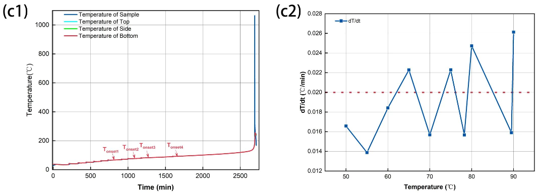 (1) 校準文件合格性判據(jù)統(tǒng)計每個臺階達到溫度平衡階段后鋁塊的溫升速率。如圖4a所示,若各臺階的溫升速率均處于一個遠小于檢測閾值的區(qū)間內(nèi),可判定校準文件合格,說明試樣處于相對嚴格的絕熱環(huán)境中,在0.02℃/min的檢測閾值條件下可準確進行電池Tonset點判定,出現(xiàn)誤判或明顯偏差的可能性低。而如圖4b和圖4c所示,均為不合格的情況。圖4b鋁塊各臺階的溫升速率過大,說明壁面對試樣存在過加熱的情況,進行電池實驗時可能導致Tonset點在電池未開始自放熱階段被提前檢出。該情況下,需要通過延長恒溫時間等方式重新進行溫差基線校準;圖4c對應的樣品尺寸很小、熱慣量過低,因此爐腔內(nèi)微弱的溫度場擾動導致樣品溫升速率劇烈波動,進行電池實驗時發(fā)生Tonset誤檢測概率高。上述情況建議更換適用于小電芯檢測的儀器進行測試。