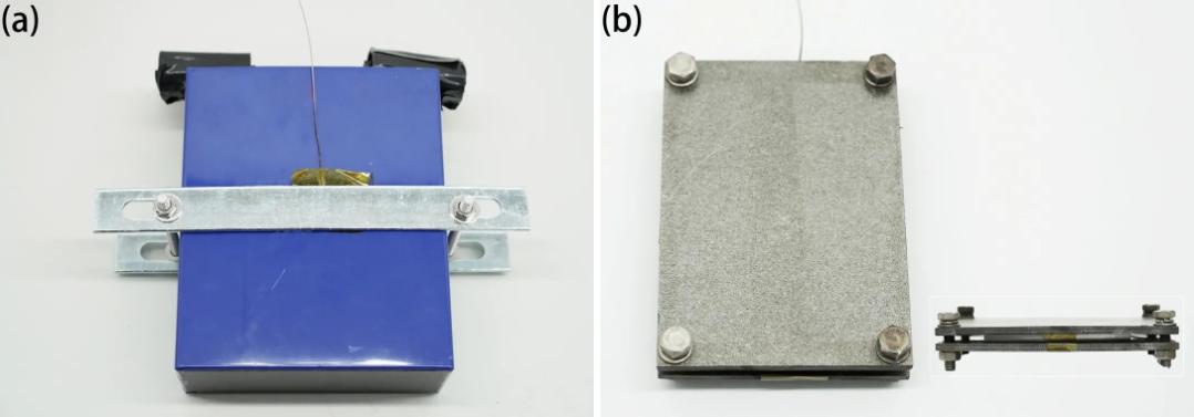 4) 使用低Phi值的夾具對樣品熱電偶進行固定和壓緊。目前常用的夾具有金屬肋條(圖5a)和云母板(如圖5b)等。云母板對電池施加的應力更均勻,但導熱性較差,需要設置更長的恒溫時間使樣品溫度達到平衡。