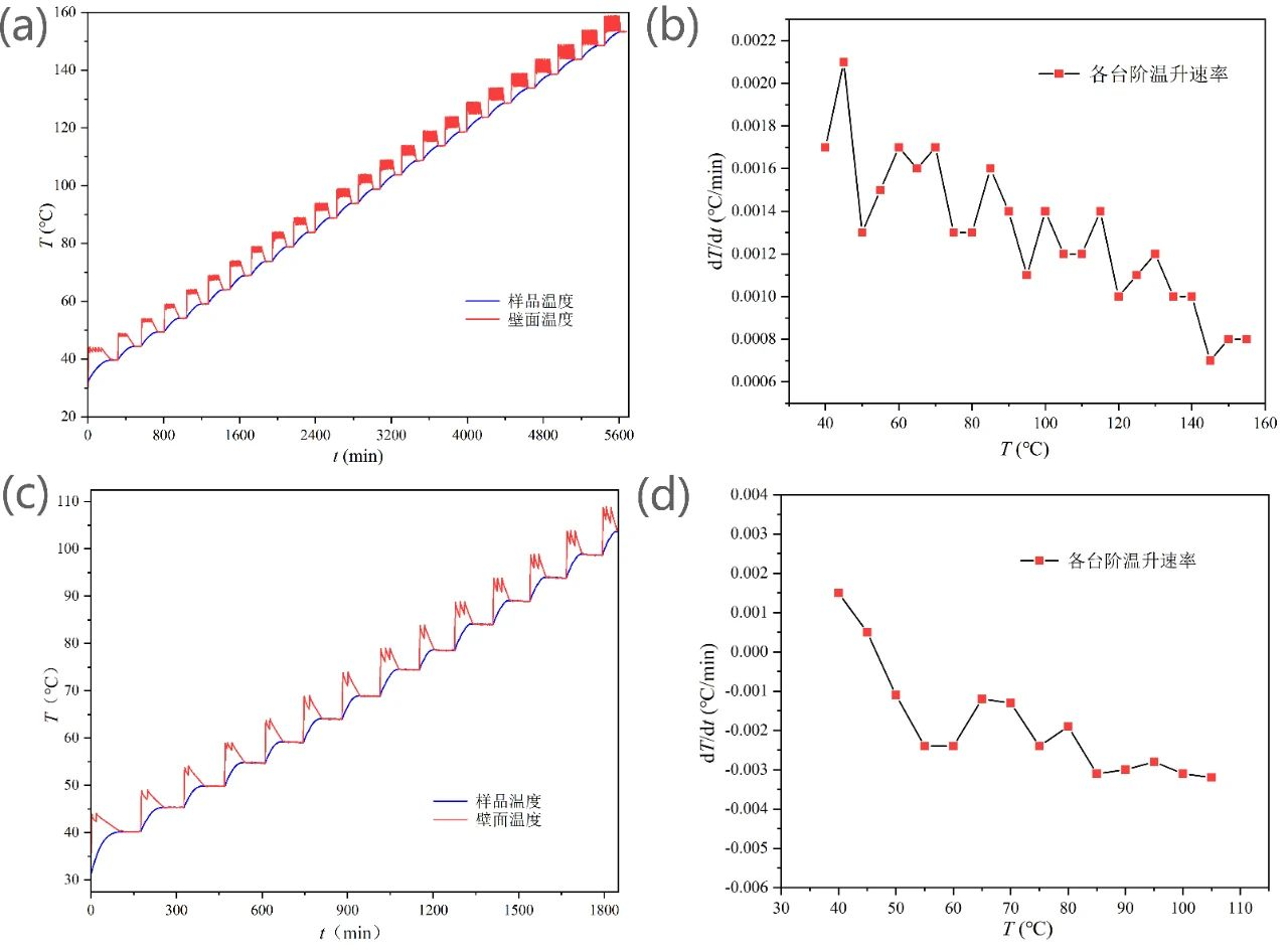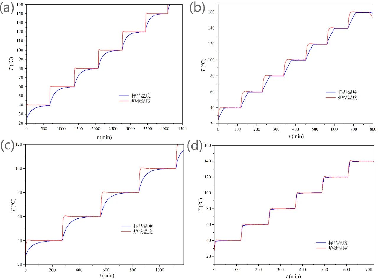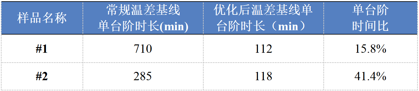 根據(jù)表1,優(yōu)化后1號和2號樣品溫升曲線的單臺階時間僅為優(yōu)化前的15.8%和41.4%,對于大質(zhì)量的樣品提升效果尤為顯著。在優(yōu)化后,兩個樣品的單臺階時長均為110min~120min,而一般溫差基線實驗需要跑6~10個臺階,因此大部分樣品均可在1天內(nèi)完成實驗,大幅提高了溫差基線實驗的效率。