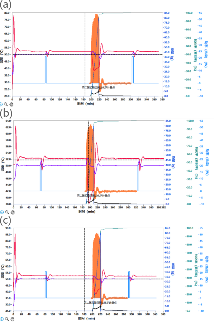 圖3 丙二酸二乙酯水解反應(yīng)(a)第一次、(b)第二次和(c)第三次實(shí)驗(yàn)放熱測(cè)量結(jié)果