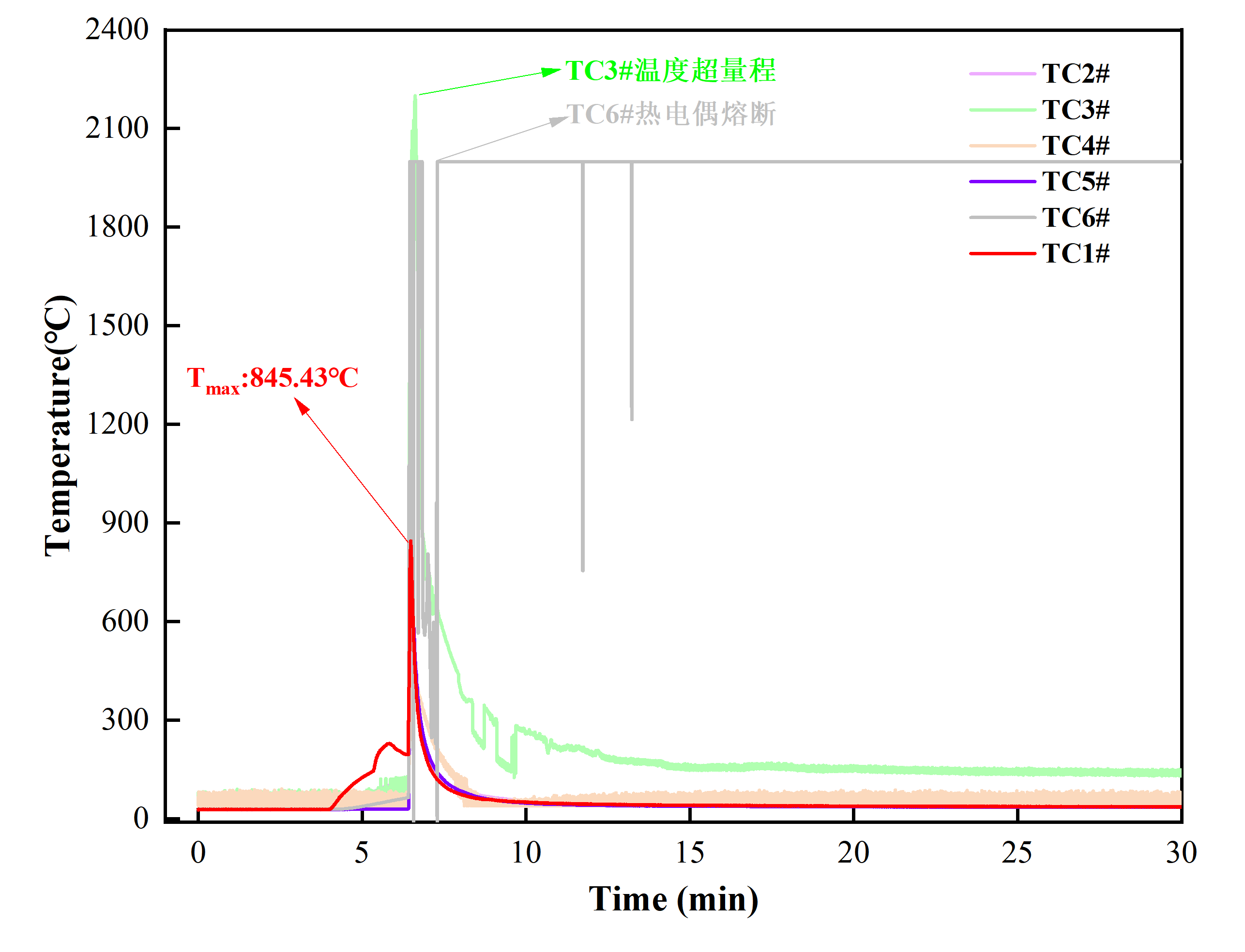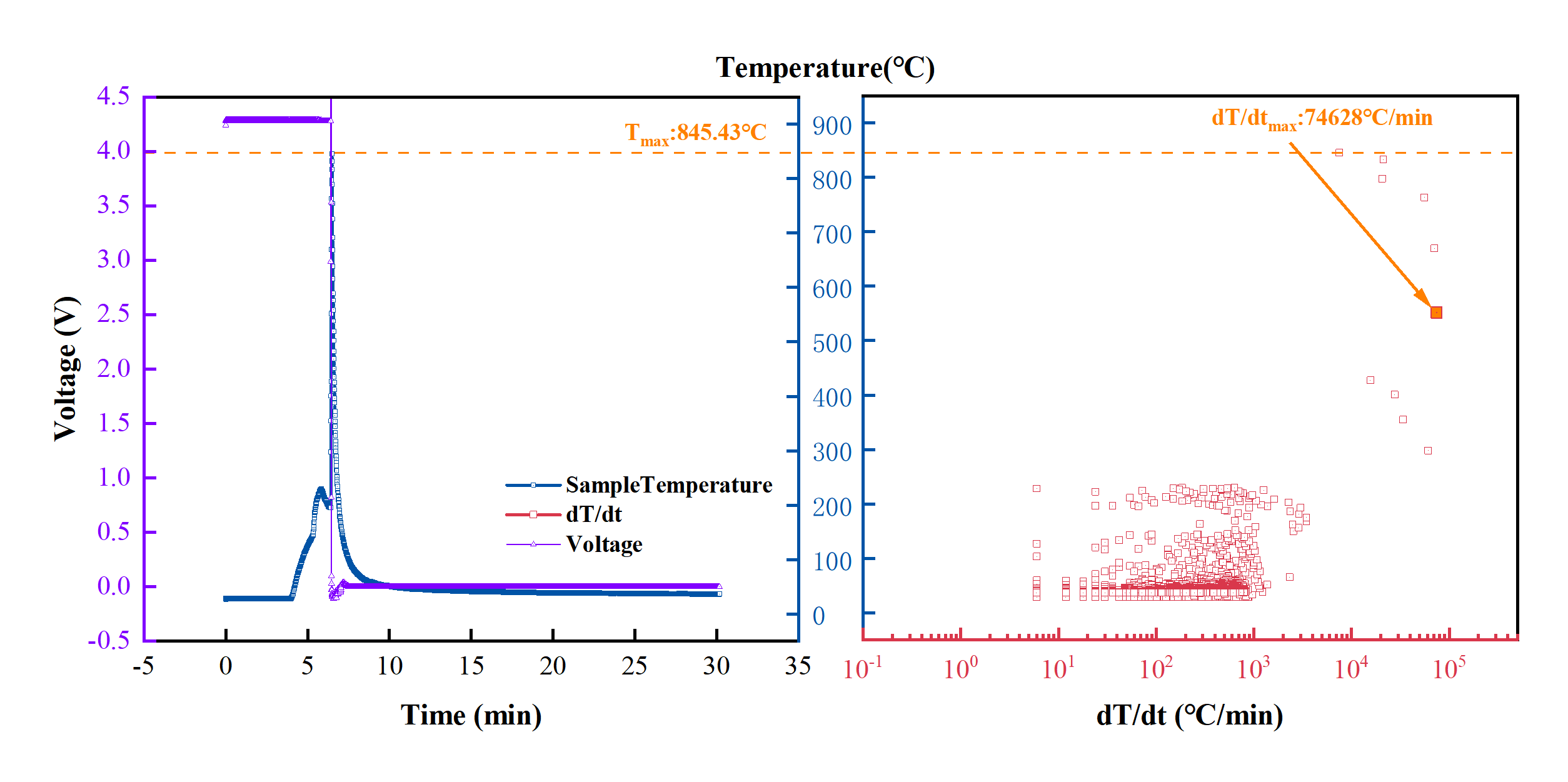 對圖2的溫度數(shù)據(jù)進行分析發(fā)現(xiàn),該電池的熱失控最高溫度845.43℃,熱失控最大溫升速率74628℃/min。而規(guī)格相近的同類型液態(tài)鋰離子電池采用同樣熱濫用方式熱失控最高溫度>1000℃,熱失控最大溫升速率>150000℃/min。可見,固態(tài)鋰金屬電池較液態(tài)鋰離子電池安全性能確實得到提升。