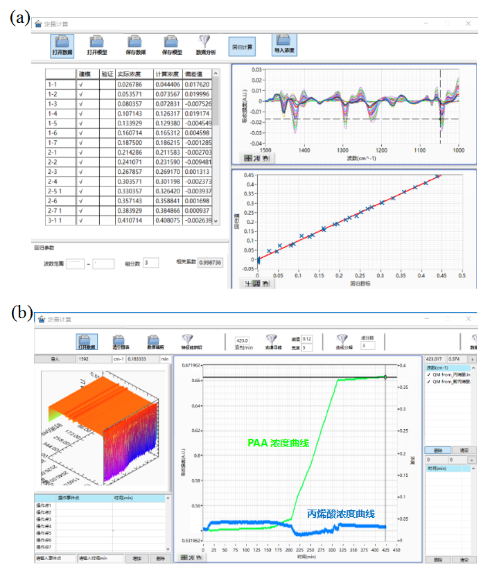 為解決水對(duì)目標(biāo)成分定量的影響,可應(yīng)用抗干擾能力較強(qiáng)的偏最小二乘法(Partial Least Squares,PLS)進(jìn)行定量分析。首先,采集不同質(zhì)量濃度比的丙烯酸/PAA混合溶液紅外光譜(圖2),隨后將光譜數(shù)據(jù)進(jìn)行預(yù)處理,最后利用PLS回歸算法關(guān)聯(lián)光譜信息與丙烯酸、PAA的質(zhì)量濃度信息建立定量校正模型。如圖3所示,通過(guò)該模型計(jì)算得到的樣品濃度預(yù)測(cè)值與真實(shí)值具有很好的相關(guān)性,丙烯酸定量的相關(guān)系數(shù)達(dá)到0.9987,而PAA達(dá)到0.9940(圖3a)。因此,在PAA水相溶液聚合過(guò)程中,通過(guò)實(shí)時(shí)采集不同時(shí)刻聚合體系的紅外光譜,并結(jié)合該定量模型能夠準(zhǔn)確地測(cè)定丙烯酸單體和PAA的瞬時(shí)濃度(圖3b),從而方便地對(duì)聚合反應(yīng)表觀動(dòng)力學(xué)參數(shù)進(jìn)行擬合計(jì)算。