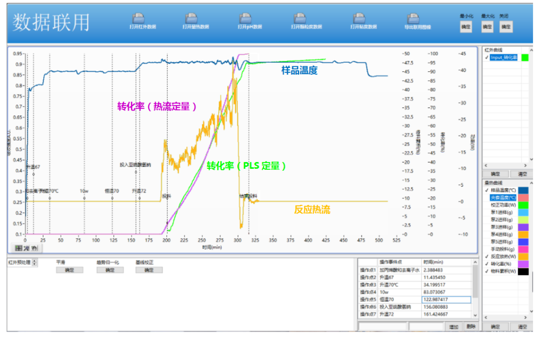 計(jì)算不同時(shí)刻PAA濃度與總濃度的比值可以得到丙烯酸單體轉(zhuǎn)化率曲線,單體的最終轉(zhuǎn)化率為92.3%。另外,利用ICPA平臺(tái)的在線量熱功能可以表征半間歇聚合反應(yīng)的實(shí)時(shí)放熱情況,放熱熱流曲線間接反映了聚合速率變化。同時(shí),通過(guò)計(jì)算累計(jì)的放熱量也可以得到反應(yīng)轉(zhuǎn)化率曲線,本質(zhì)上該曲線體現(xiàn)了聚合反應(yīng)完成度變化,同樣可以表現(xiàn)反應(yīng)的動(dòng)力學(xué)特征。如圖4所示,通過(guò)數(shù)據(jù)聯(lián)用,可以發(fā)現(xiàn)紅外定量與量熱得到的反應(yīng)轉(zhuǎn)化率曲線趨勢(shì)基本一致,可以相互印證上述兩種ICPA技術(shù)對(duì)于本案例動(dòng)力學(xué)研究的適用性與準(zhǔn)確性。除水相溶液聚合反應(yīng)外,本文介紹的方法同樣適用于其他水相反應(yīng)體系,可降低或消除水對(duì)目標(biāo)物質(zhì)定量分析的干擾。