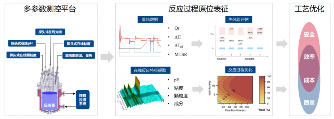 在上文提到的原料藥開(kāi)發(fā)過(guò)程中,如果我們能夠在合成反應(yīng)過(guò)程中對(duì)反應(yīng)特征參數(shù)進(jìn)行實(shí)時(shí)監(jiān)測(cè)無(wú)疑能夠幫助研究人員更快、更好地進(jìn)行工藝開(kāi)發(fā)和優(yōu)化。原位表征和過(guò)程分析(ICPA)平臺(tái)集成了功能強(qiáng)大的原位、實(shí)時(shí)測(cè)試能力。例如,可以通過(guò)在線分子光譜儀實(shí)時(shí)分析反應(yīng)體系的組分信息及含量變化;可以利用在線粘度計(jì)、在線顆粒度、在線PH計(jì)等儀器測(cè)定體系粘度、顆粒度和PH值等參數(shù)變化;利用反應(yīng)量熱儀測(cè)定反應(yīng)放熱速率、絕熱溫升、物料累積等熱安全數(shù)據(jù)。上述測(cè)試手段和數(shù)據(jù)將幫助試驗(yàn)人員進(jìn)行反應(yīng)過(guò)程分析、機(jī)理研究和風(fēng)險(xiǎn)評(píng)估,并從安全、質(zhì)量、成本等維度快速、高效地進(jìn)行原料藥合成工藝優(yōu)化。