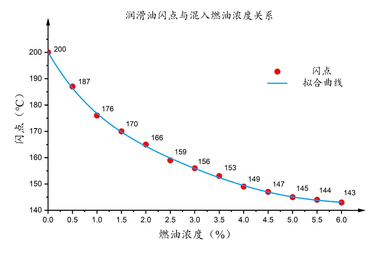 根據(jù)實(shí)驗(yàn)結(jié)果,可以發(fā)現(xiàn)潤(rùn)滑油中柴油含量越多,閃點(diǎn)越低。這是由于潤(rùn)滑油的閃點(diǎn)通常在200℃以上,柴油的閃點(diǎn)一般在45℃~120℃之間,少量低沸點(diǎn)雜質(zhì)混入將大幅降低高沸點(diǎn)物質(zhì)的閃點(diǎn)[1]。同時(shí)通過(guò)測(cè)試數(shù)據(jù)可以建立潤(rùn)滑油稀釋模型,當(dāng)?shù)玫轿粗獫?rùn)滑油樣品的閃點(diǎn)值后,利用模型可以判斷油樣是否已被污染,并定量分析其受污染程度。