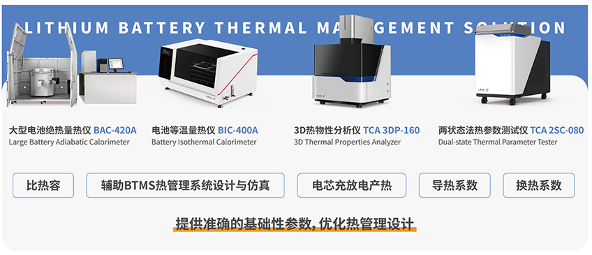 熱管理測試解決方案可對電池包或系統(tǒng)的熱擴(kuò)散特性進(jìn)行驗證,獲取電池絕熱溫升、電池導(dǎo)熱系數(shù)等熱管理仿真核心參數(shù),確保電池產(chǎn)品滿足國家安全標(biāo)準(zhǔn)的要求。