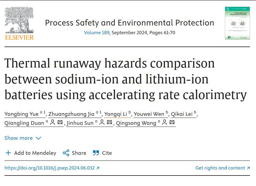 中國科學技術大學王青松教授團隊在Process Safety and Environmental Protection(IF:6.9)發(fā)表題為Thermal runaway hazards comparison between sodium-ion and lithium-ion batteries using accelerating rate calorimetry論文,該成果由中國科學技術大學火災科學國家重點實驗室和中國南方電網(wǎng)發(fā)電有限公司儲能研究所等機構(gòu)聯(lián)合支持。