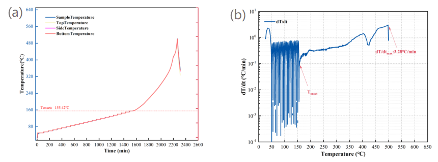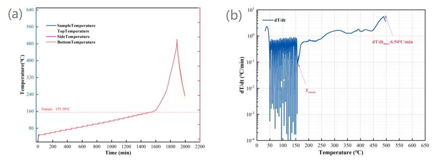 本次實驗采用BAC-90A小型電池絕熱量熱儀的HWS模式測試纖維鋰電池?zé)崾Э剡^程。該實驗?zāi)J侥軌驕蚀_測量得到鋰電池自放熱起始溫度(T1)、熱失控起始溫度(T2)等關(guān)鍵電池?zé)岚踩珔?shù)。