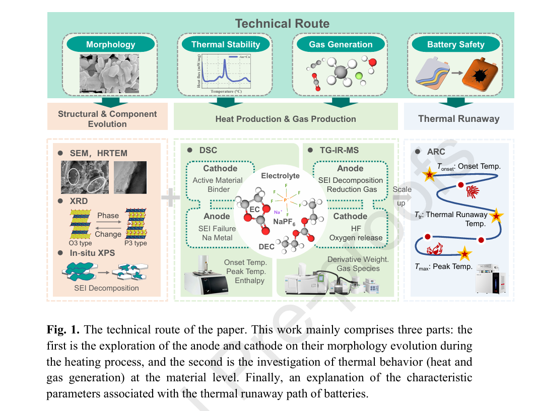 為實現對NFM/HC材料組合多層次的熱安全理解,研究采用了特定的技術路線對鈉離子電池從材料到電池層級的熱穩(wěn)定性進行深度剖析。具體包括: