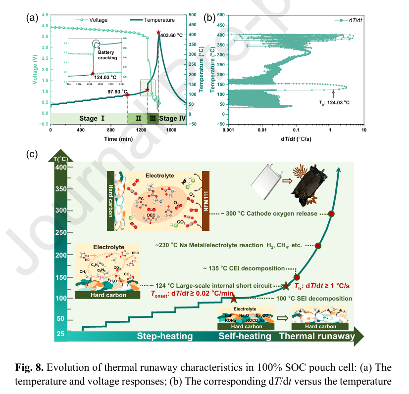 運用表面分析和原位加熱XPS技術,研究正極的結構演變和負極的鈉演化過程,發(fā)現正極在加熱過程中發(fā)生顯著相變并伴有氧氣釋放,負極上SEI大量降解導致Na2CO3 和 Na2O 形成,且在負極加熱過程中觀察到金屬鈉出現;