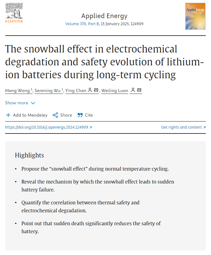 華東理工大學欒偉玲教授團隊在Applied Energy(IF:11)發(fā)表題為《The snowball effect in electrochemical degradation and safety evolution of lithium-ion batteries during long-term cycling》的研究論文,該成果由華東理工大學先進電池系統(tǒng)與安全重點實驗室(CPCIF)、機械與動力工程學院等機構(gòu)聯(lián)合支持。
