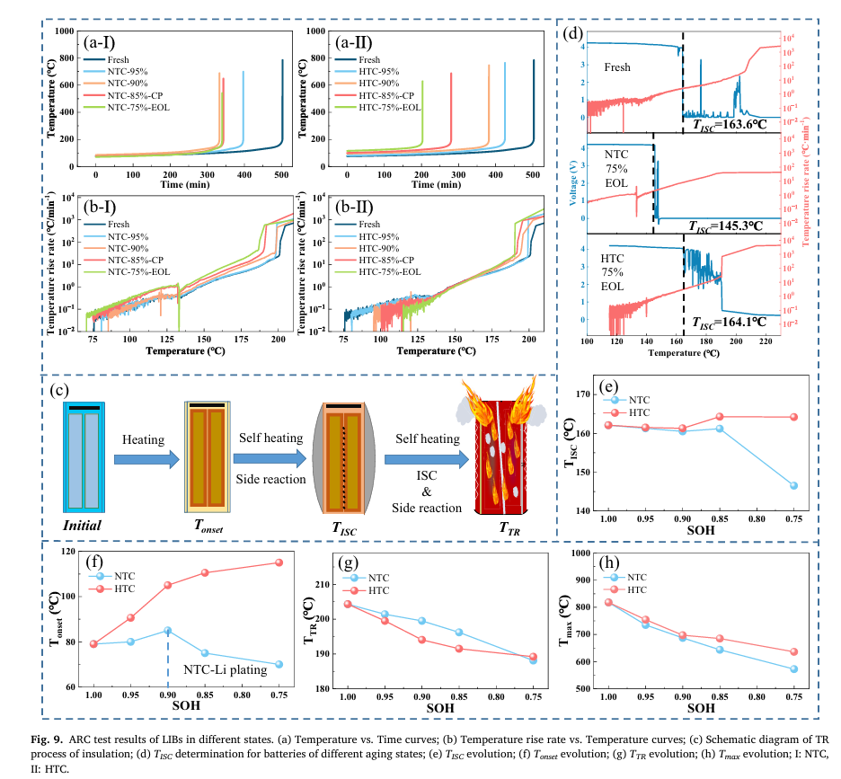 本研究采用小型電池絕熱量熱儀BAC-90A對在不同退化路徑下老化至特定狀態(tài)的電池進行絕熱熱失控測試。獲取了自發(fā)熱起始溫度(Tonset)、內(nèi)部短路觸發(fā)溫度(TISC)、熱失控起始溫度(TTR)和熱失控最高溫度(Tmax)四個熱失控特征參數(shù)。結(jié)果表明高溫循環(huán)和常溫循環(huán)老化過程中的熱失控特性存在顯著差異。