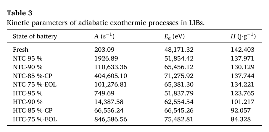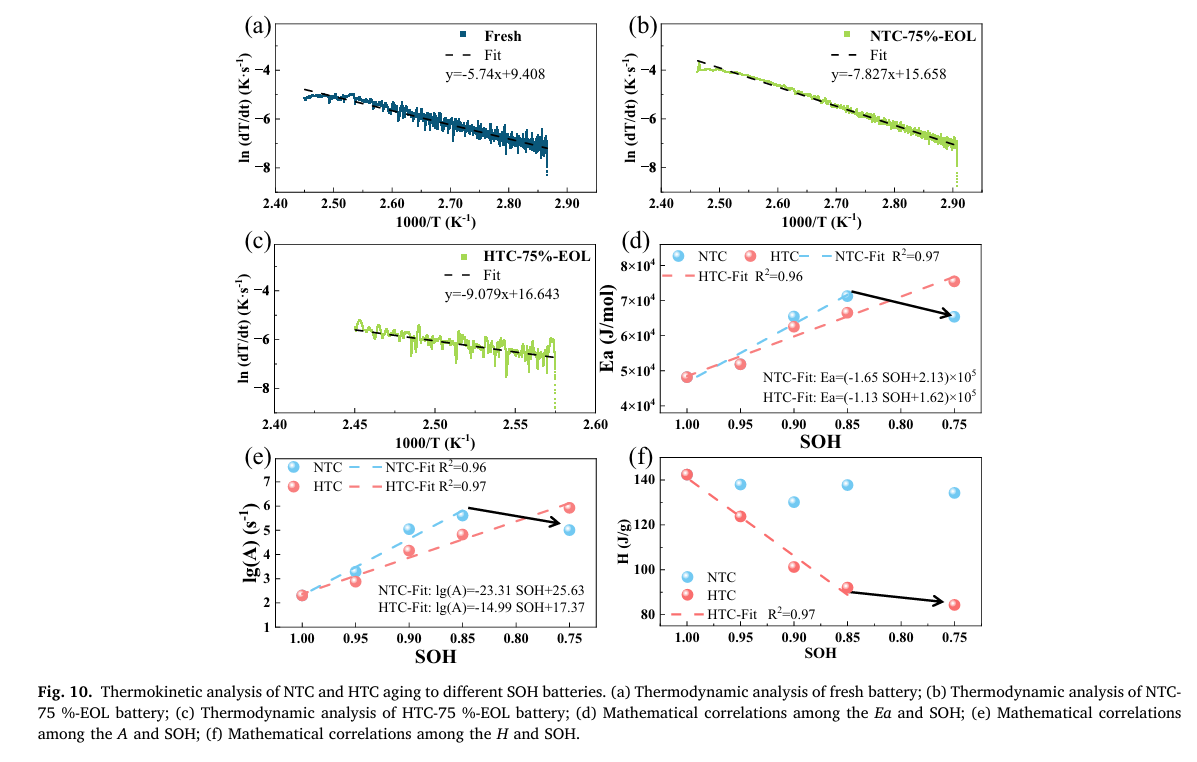 為進一步分析老化引起的電池熱安全性變化,該研究結(jié)合小型電池絕熱量熱儀BAC-90A的測試結(jié)果對電池絕熱溫升過程進行了動力學分析。結(jié)合dT/dt特性曲線,采用Arrhenius等方程計算,獲取了常溫循環(huán)和高溫循環(huán)條件下不同老化狀態(tài)電池的放熱反應動力學參數(shù)。揭示了活化能Ea與電池SOH之間的關(guān)系。結(jié)果表明,對于高溫循環(huán)和常溫循環(huán)的線性老化階段,Ea值隨著SOH的降低而單調(diào)遞增。
