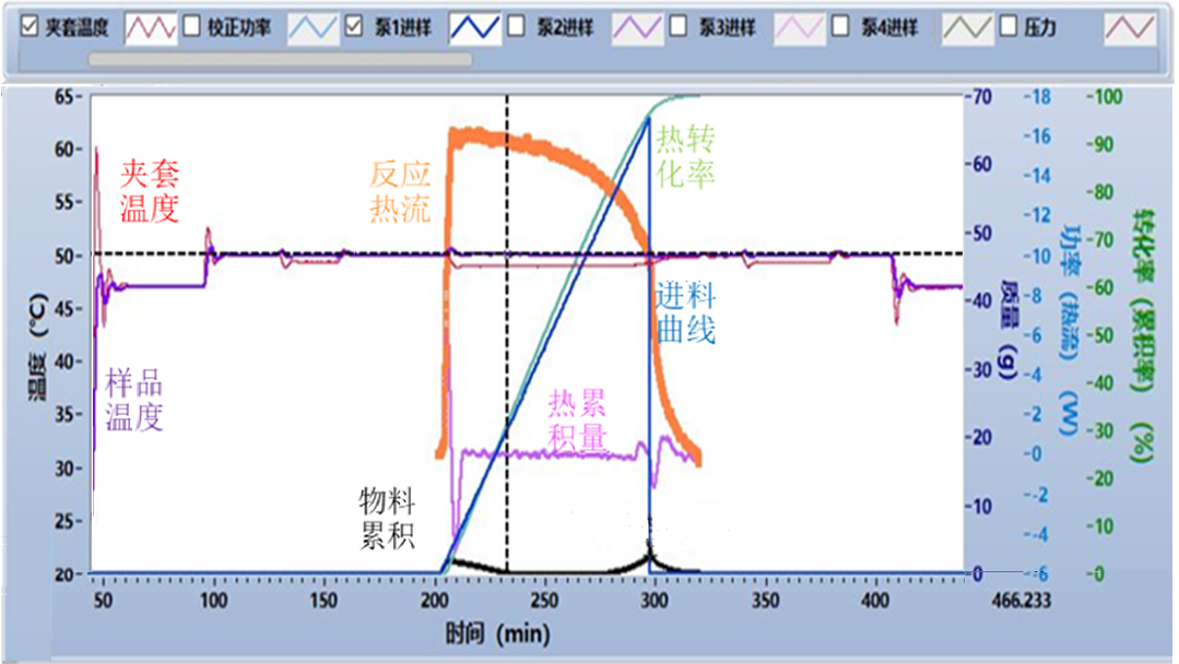 反應量熱儀軟件中可設置多步驟實驗流程,并可通過油浴控溫或加熱器控溫實現(xiàn)各步驟反應溫度的精確控制。實驗流程結(jié)束后自動計算得到不同時刻反應放熱功率(熱流)、物料和熱積累、熱轉(zhuǎn)化率、MTSR等數(shù)據(jù),可直觀地反映出目標反應的放熱特征以及過程變化。主要參數(shù)可按照以下公式進行計算:
