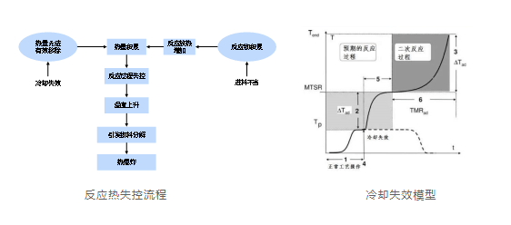 熱失控的本質(zhì)是反應體系的放熱速率與移熱速率之間發(fā)生失衡而導致熱積累。正常工藝條件下,化學反應會在可控的溫度下進行。而一旦發(fā)生冷卻失效或進料過快等異常情況,反應體系產(chǎn)生的熱量無法被反應器冷卻系統(tǒng)完全移除,反應溫度將由于熱積累而偏離正常條件。一旦溫度達到物料的分解溫度,將引發(fā)二次反應,導致反應物、產(chǎn)物分解,引起反應器內(nèi)溫度壓力急劇升高,最終導致噴料、反應器破壞,甚至燃燒、爆炸事故。