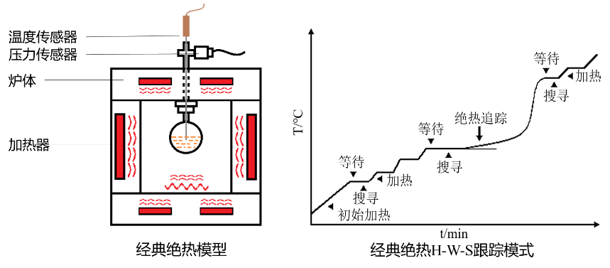 絕熱加速量熱儀的經(jīng)典工作模式為“加熱—等待—搜尋”(H-W-S)模式,工作前可設置實驗起始溫度、終止溫度、斜率敏感度、加熱幅度和等待時間等參數(shù)?!凹訜帷彪A段,量熱儀的溫度按設定的加熱幅度升高;“等待”階段,控制器通過比較樣品室溫度與絕熱爐各個區(qū)域的溫度,保持絕熱爐內(nèi)的溫度處于均勻平衡狀態(tài);“搜尋”階段,若檢測到樣品升溫速率大于設置的閾值(如0.02℃/min),則進入絕熱追蹤階段,通過程序控溫保持樣品池四周的絕熱環(huán)境;否則,量熱儀自動進入下一個“加熱—等待—搜尋”流程。